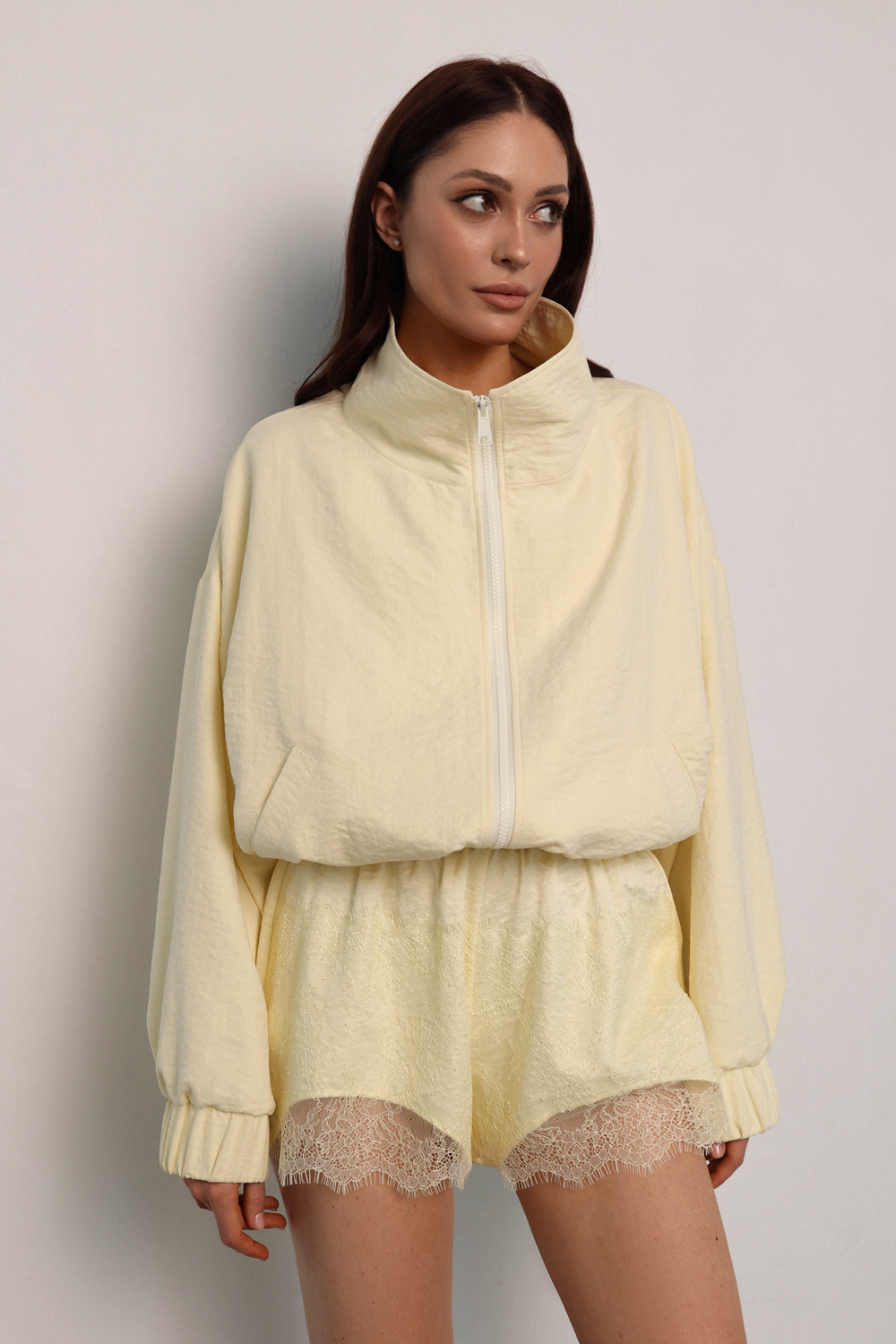К анораку можно подобрать спортивные брюки в тон. Брюки имеют кулиску по низу, что позволяет носить их как в расслабленном прямом силуэте, так и затянуть, создавая форму джоггеров.