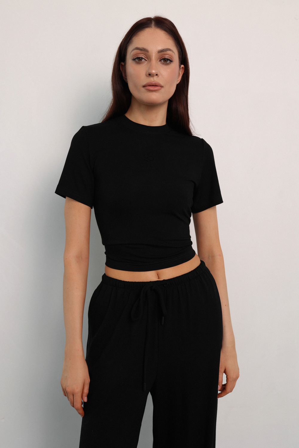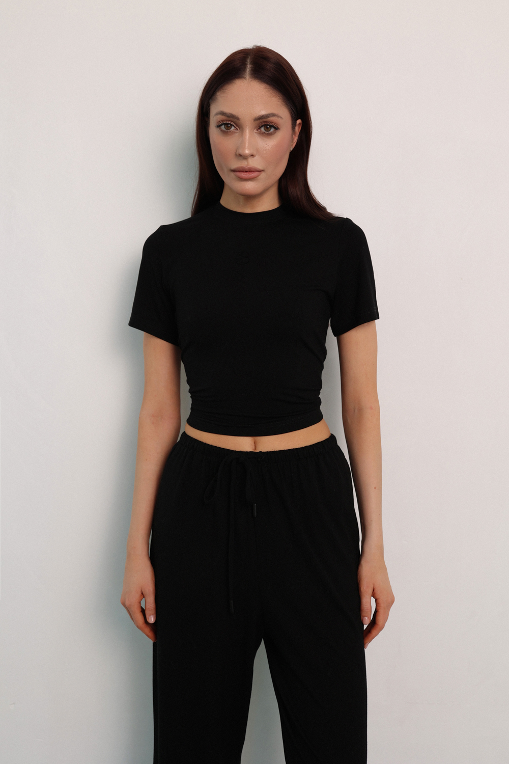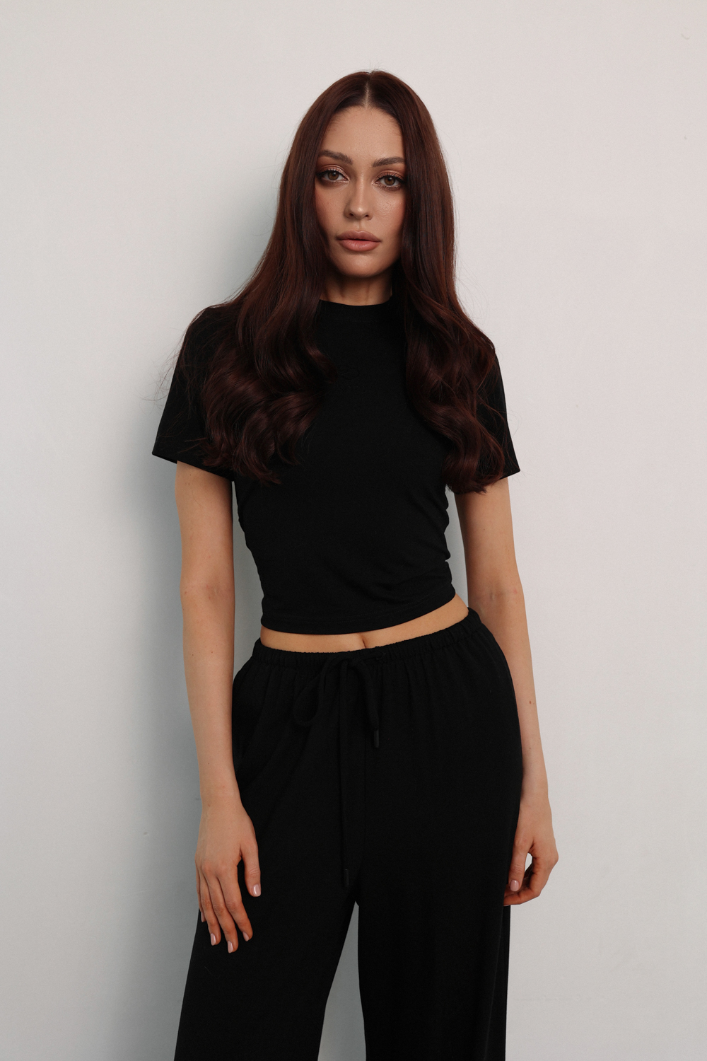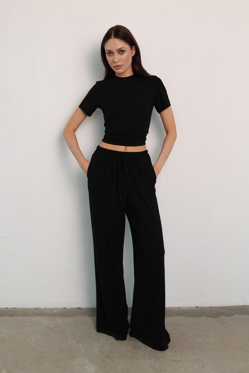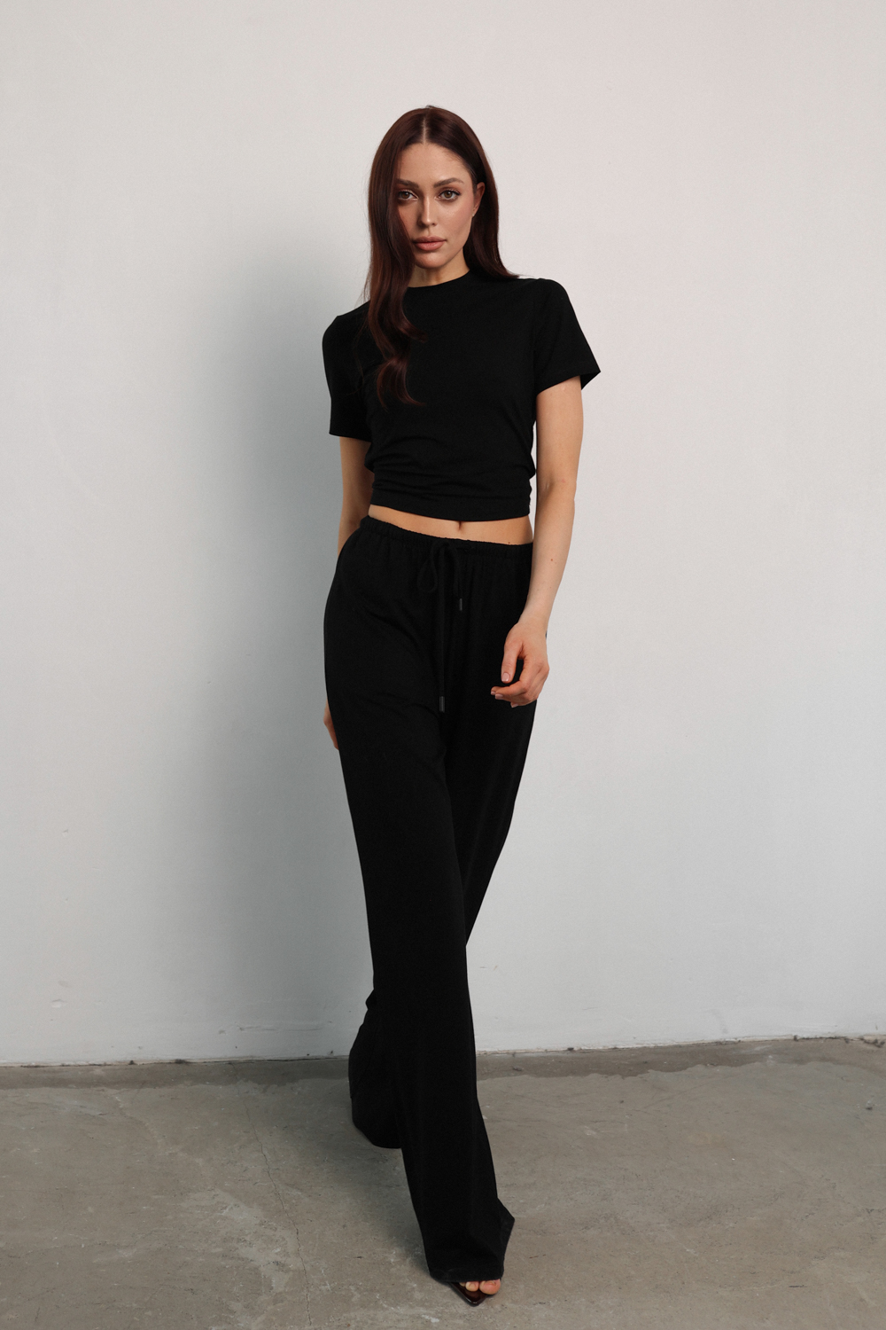 Комплект выполнен в классическом чёрном цвете и отражает актуальный тренд на комфортную и стильную одежду. Брюки можно приобрести отдельно или в комплекте с футболкой, создавая стильный и универсальный образ.