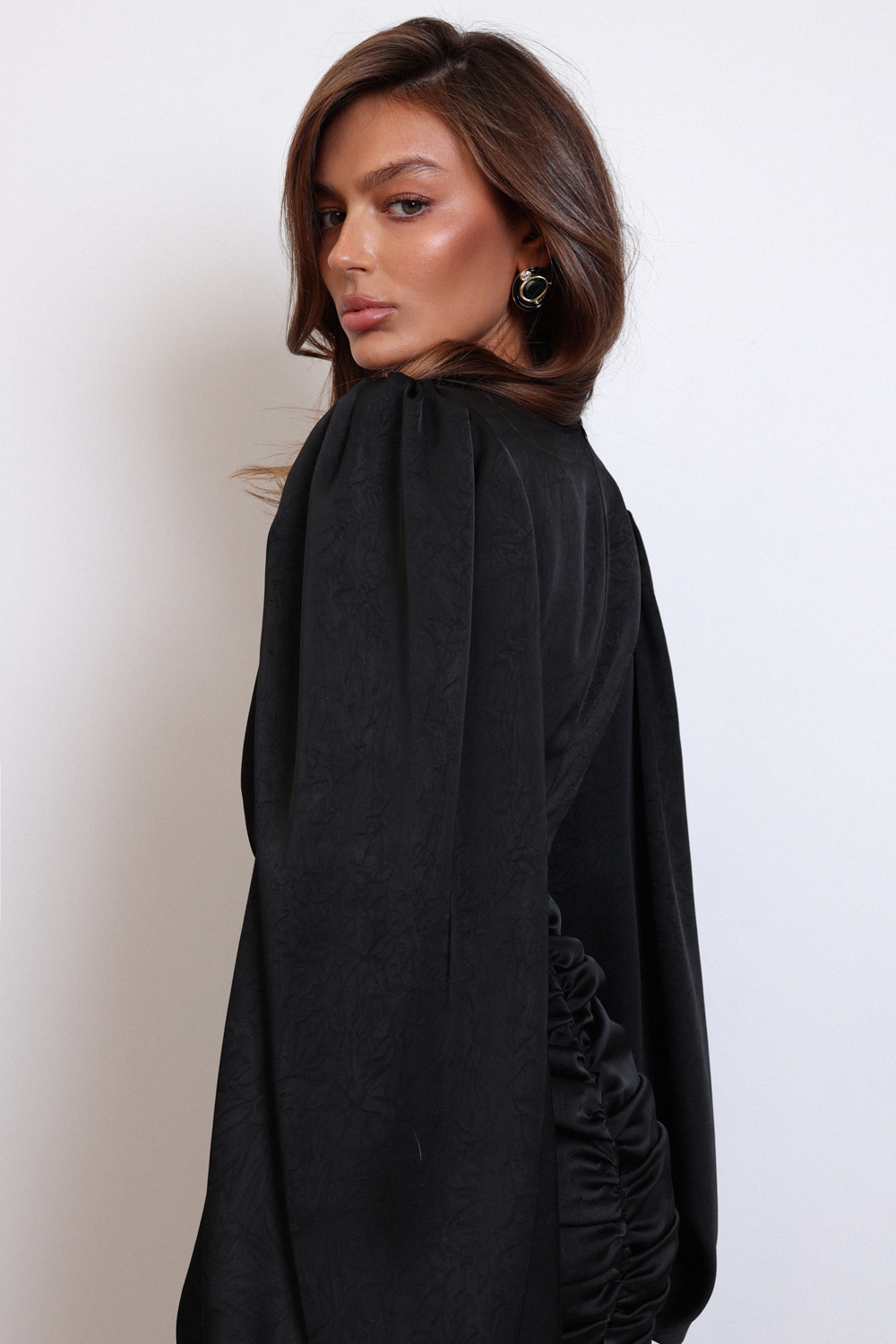 Модель с изящной драпировкой на юбке и по планке, что добавляет ей изысканности и оригинальности. Рукава закреплены резинкой на запястьях.